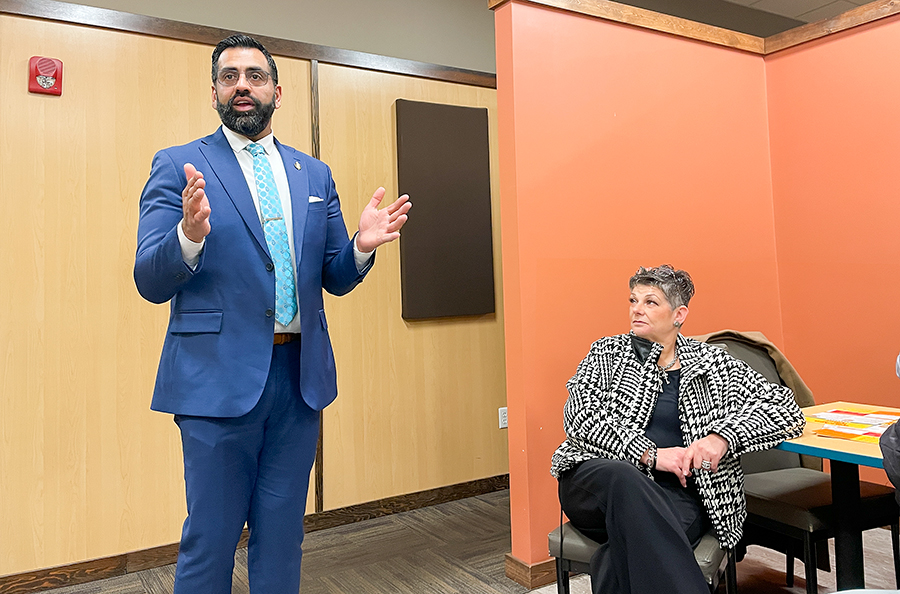 CHATTING WITH THE GUESTS – Obby Khan met one-to-one with visitors following his meeting at the Blarney Stone Restaurant on Tuesday. Khan hopes to defeat the NDP and capture the premier’s seat in the next provincial election, expected in 2027.